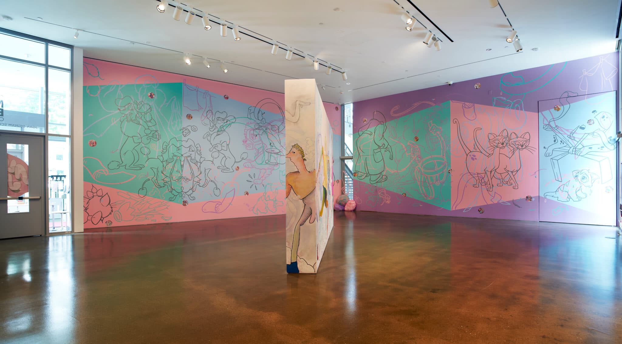 Catalina Schliebener Muñoz’s commission also veers into multiple dimensions. Animales domésticos (2024) is a floor-to-ceiling mural that wraps around two walls. Schliebener Muñoz grounds the composition in rhombus blocks of pink, purple, and blue that create the illusion of hallways—an optic trick taken from the static backgrounds of mid-century animations. Indeed, characters from three Disney films (One Hundred and One Dalmatians, Oliver and Company, and The Aristocats) appear in configurations of vinyl cut-outs, with their features partially removed or layered on top of one another.
