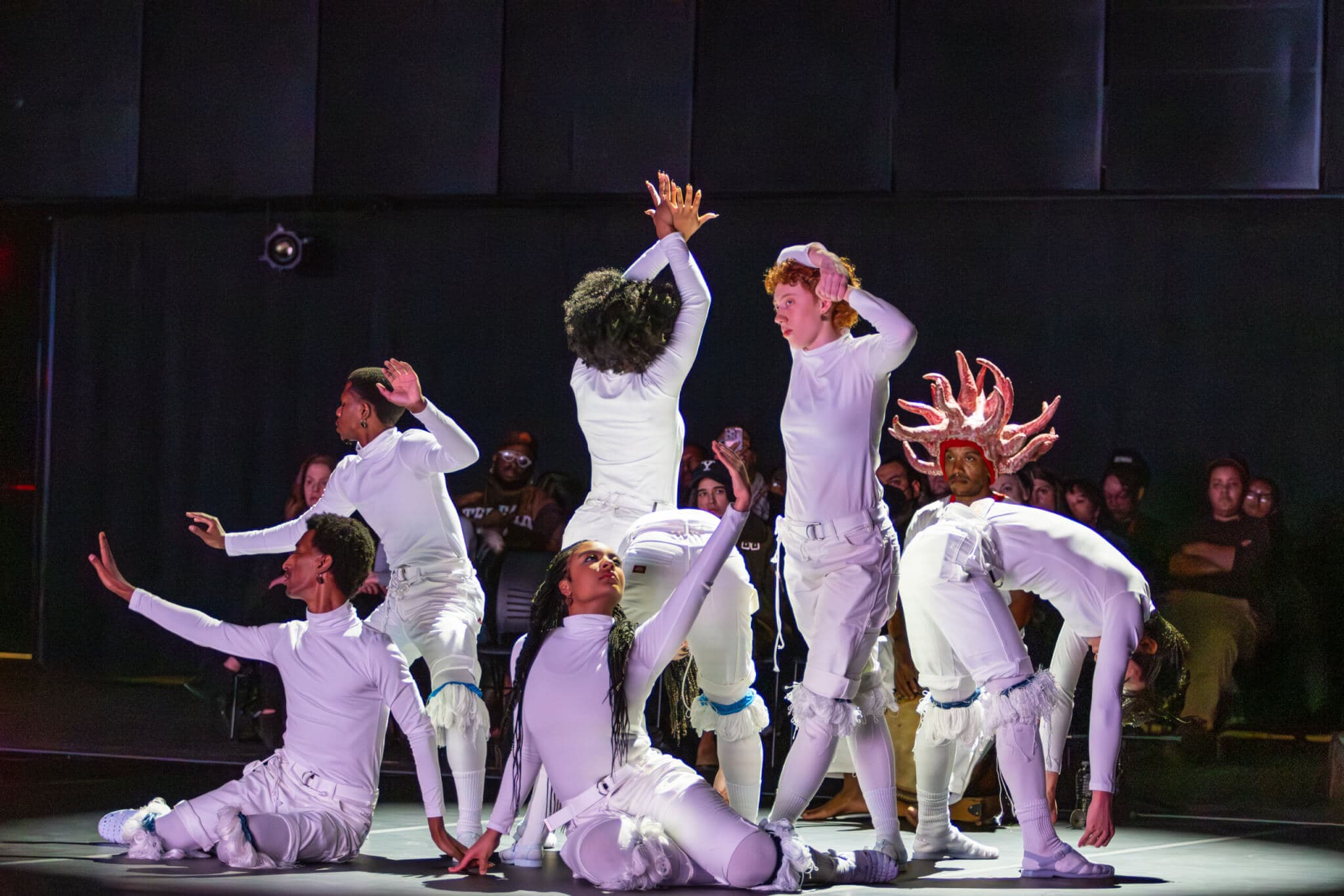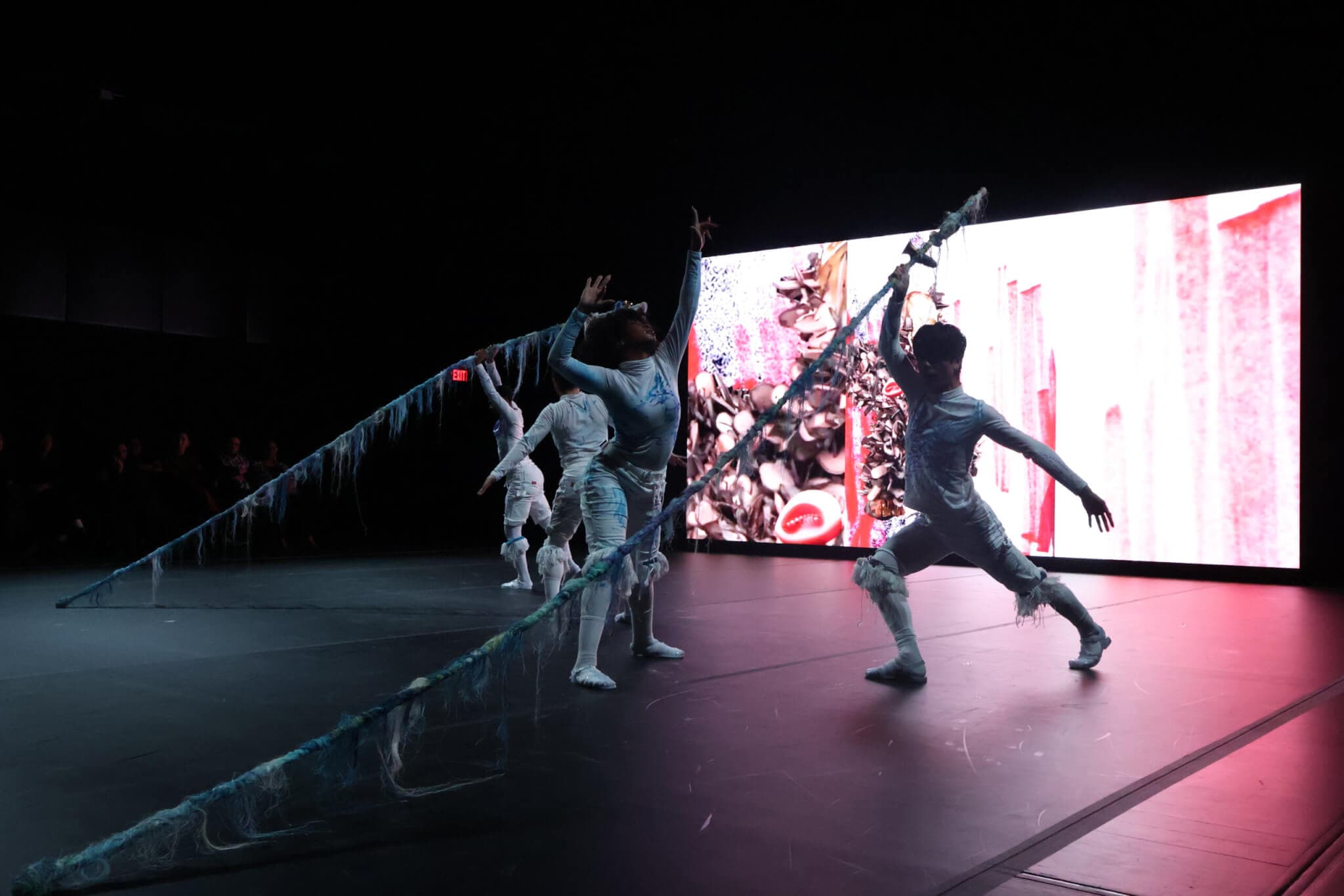 Julien Creuzet, Algorithm ocean true blood moves, performed at the Lindemann Performing Arts Center, February 20, 2025. Choreography by Ana Pi. Photo by Erin X. Smithers. Courtesy of The Bell / Brown Arts Institute.