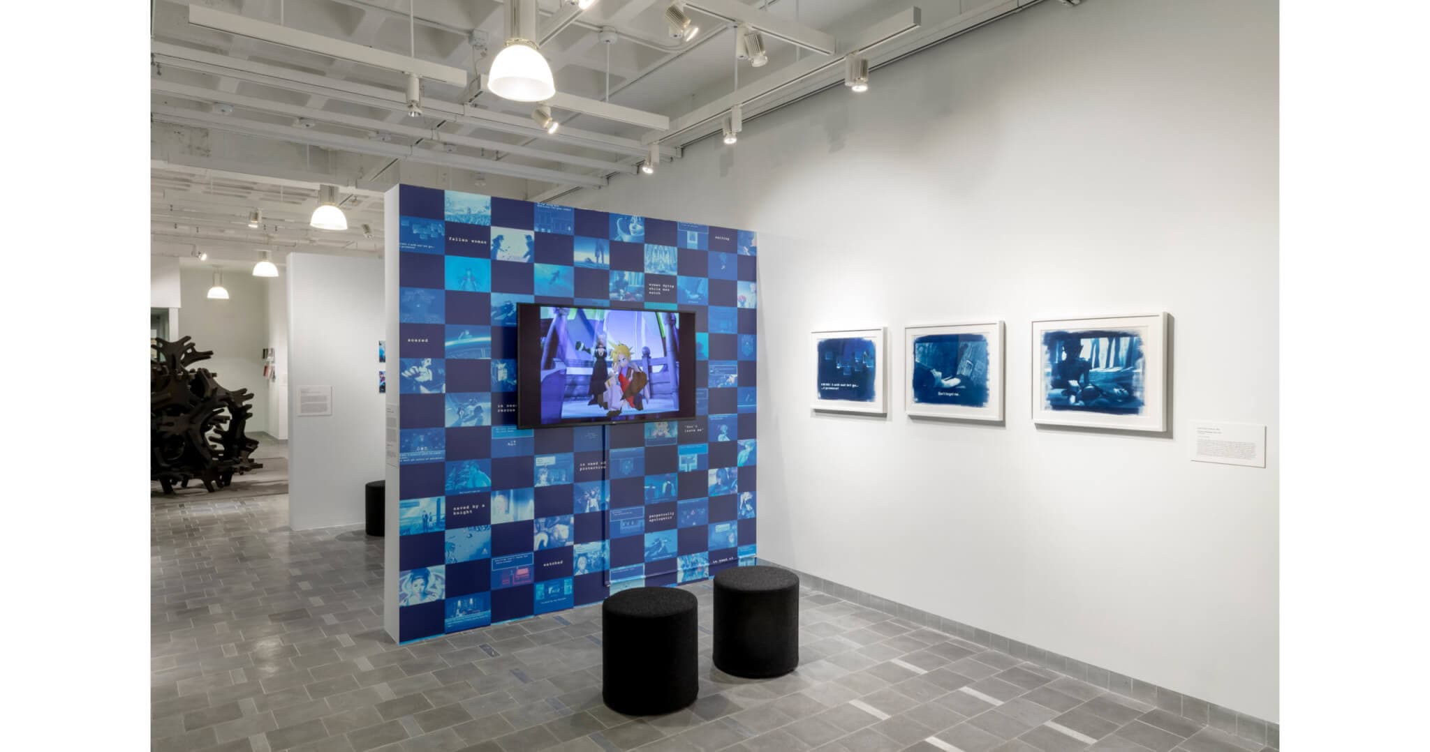 Installation view of “At Play” at Gallery 360, Boston, 2022–2023. Pictured are works by Angela Washko from the series Heroines with Baggage, including cyanotypes (2012/2022), a wallpaper installation (2012/2022), and the video Don’t Leave Me! (2012). Photo by Mel Taing. Courtesy of the artist.