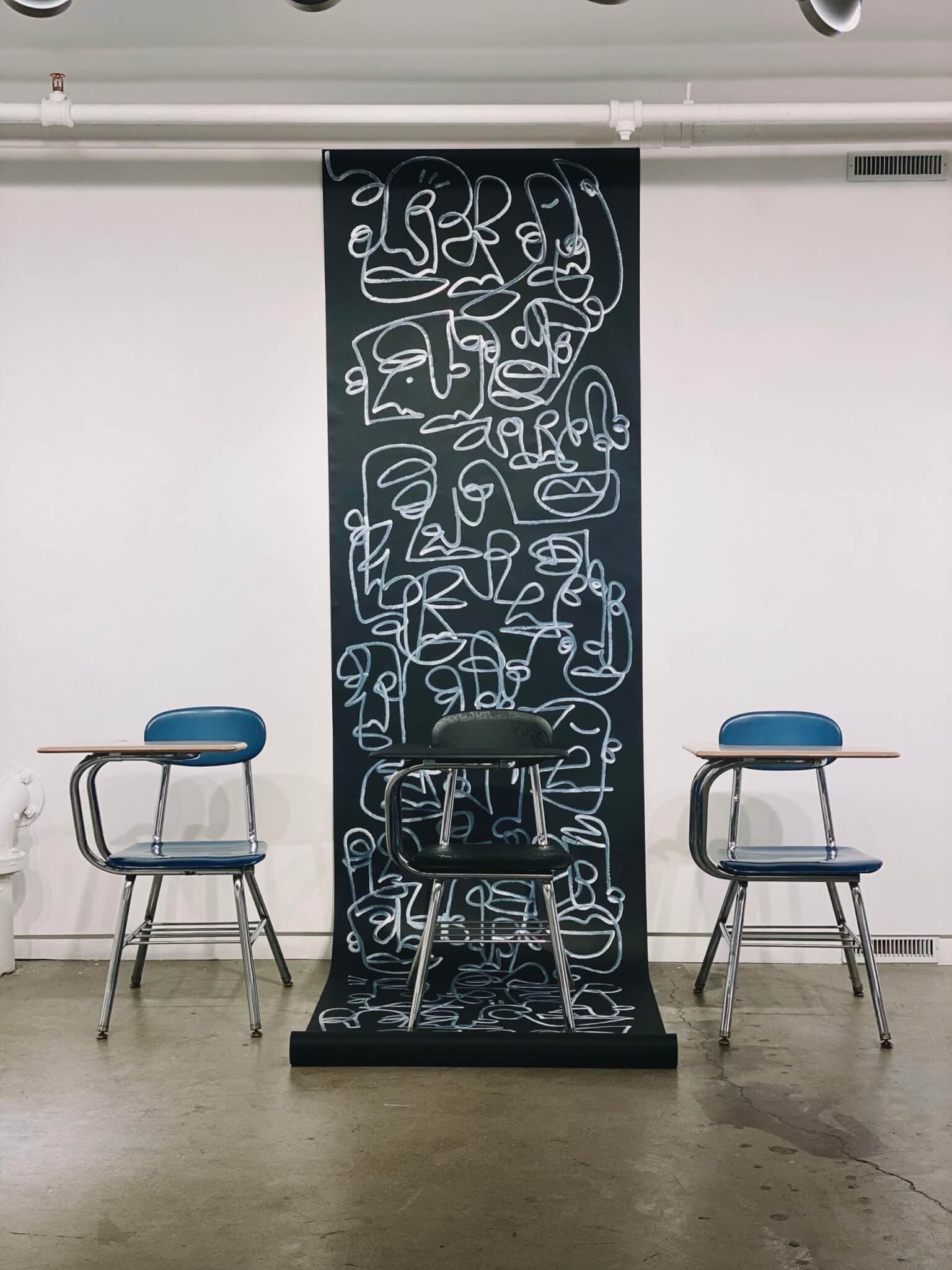 The three installations on view all use different kinds of chairs to interrogate sites of simultaneous comfort and discomfort. Saving Face (2024) features Horton’s signature line drawing using krink marker in an unusual place: the plastic covering of a plush chair. During his talk, Horton recalled the hot sticky feeling of visiting family and sitting on his elder’s sofa draped in plastic in the New York City summer heat. Transforming that discomfort, the installation asks us what old ideas we might be holding onto and whether their preservation is truly to our benefit. Doing the work to answer that question, Horton offers a thoughtful examination of his own ego and insecurities.