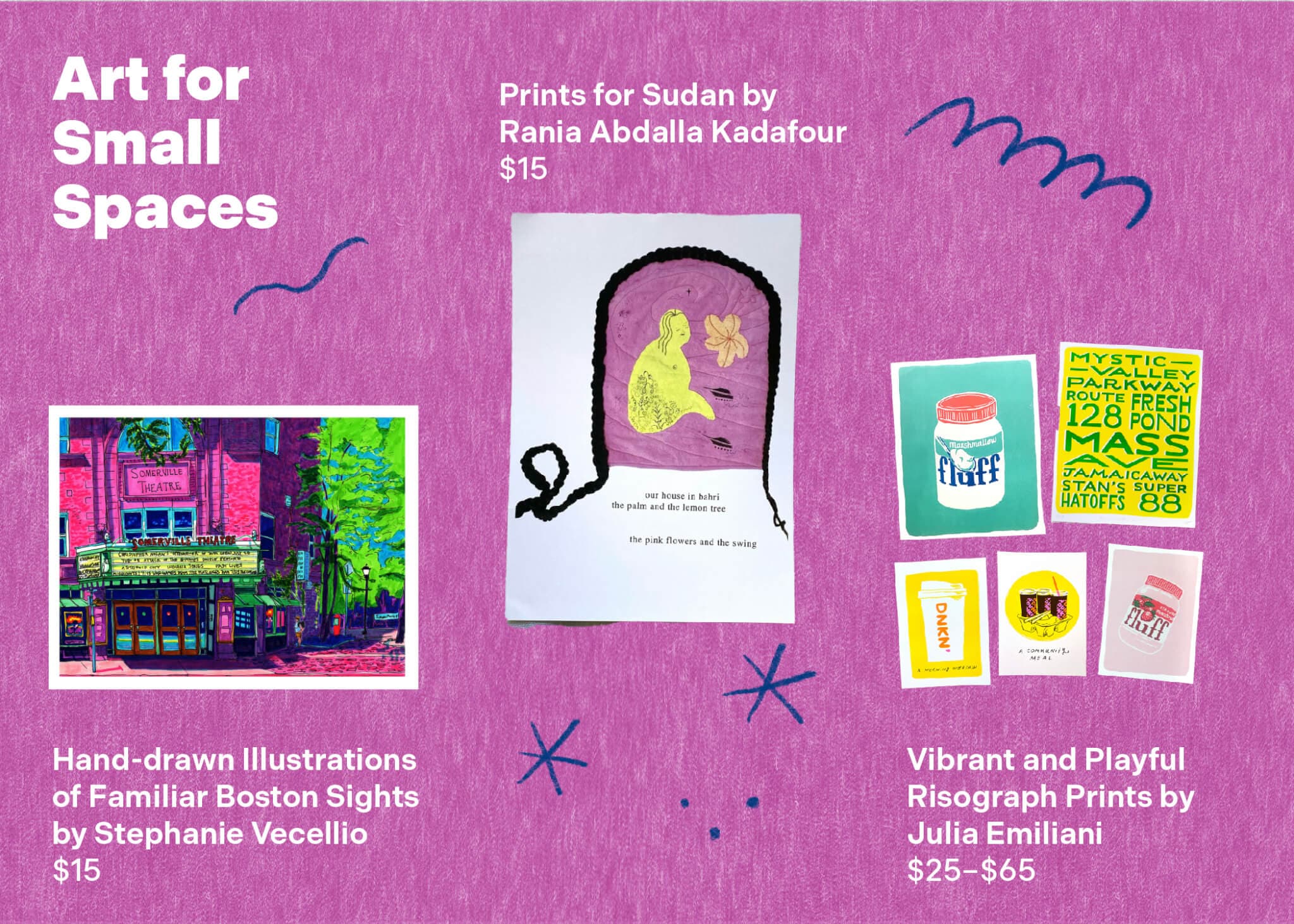 Punchy pinks, blues, and oranges saturate Somerville-based artist Stephanie Vecellio’s scenic marker and pen drawings. Take a peek at her shop and surely you’ll recognize well-known local landmarks, like Coolidge Corner Theatre and Copley Square, or you may even come across a familiar residential street corner. It’s Vecellio’s eye toward the everyday Bostonisms—a pesky too-bright streetlight, a not-quite-upright telephone pole, a sign for never-ending road work—that make these pieces equal parts whimsy, comedy, and perfect for displaying.