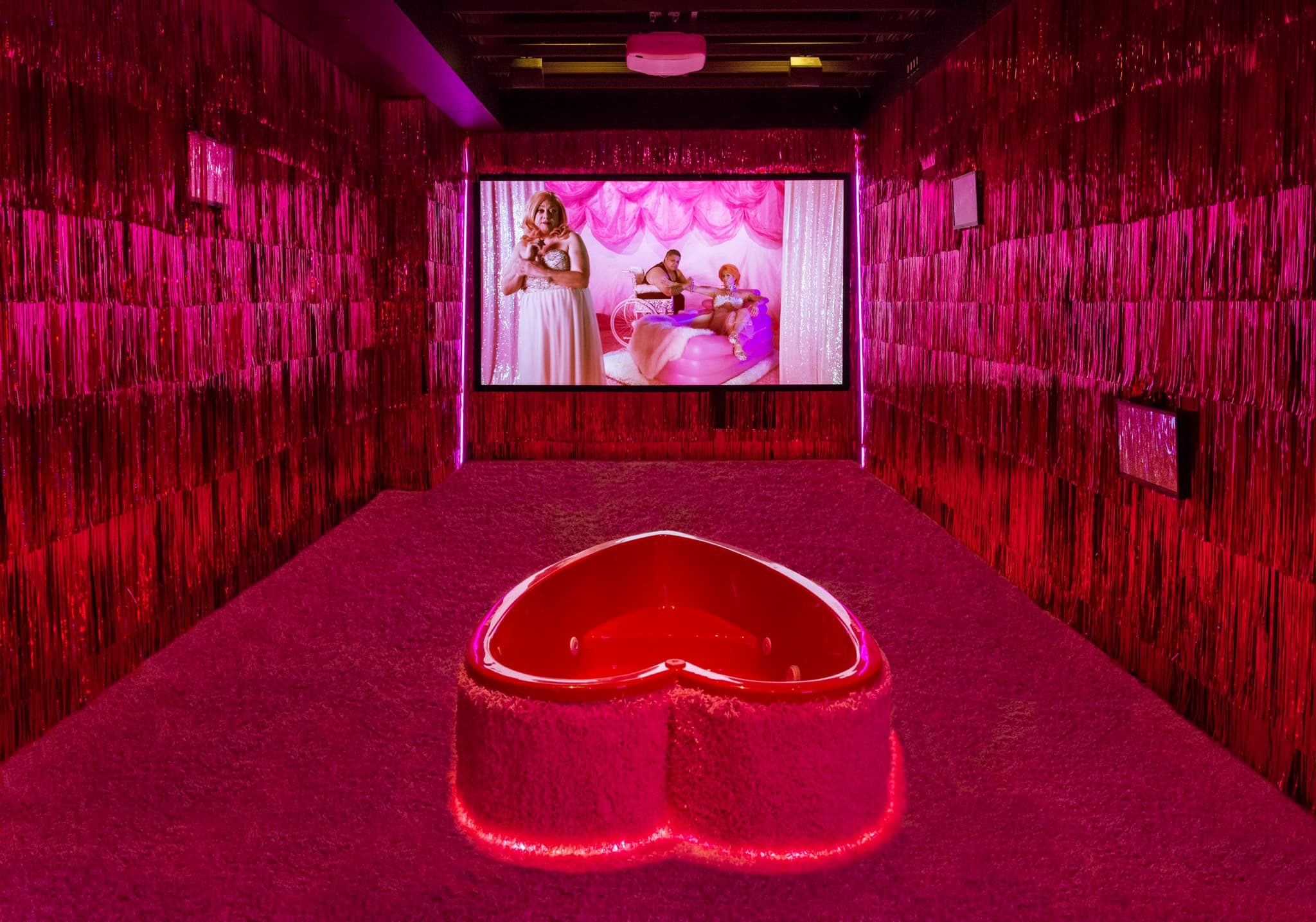 Meanwhile at the MFA, Samantha Nye’s solo exhibition “My Heart’s in a Whirl” was filled with care, joy, intimacy, and PINK! The whimsical installation featured soft pink carpet under your feet, shimmery pink tassels enveloping you, and a heart-shaped hot tub placed for seating. You can’t help but let your heart “whirl” while watching Nye’s queered versions of Scopitone videos originally from the 1950s and ’60s. It was my first time sitting in a hot tub to watch a video, but hopefully not my last.