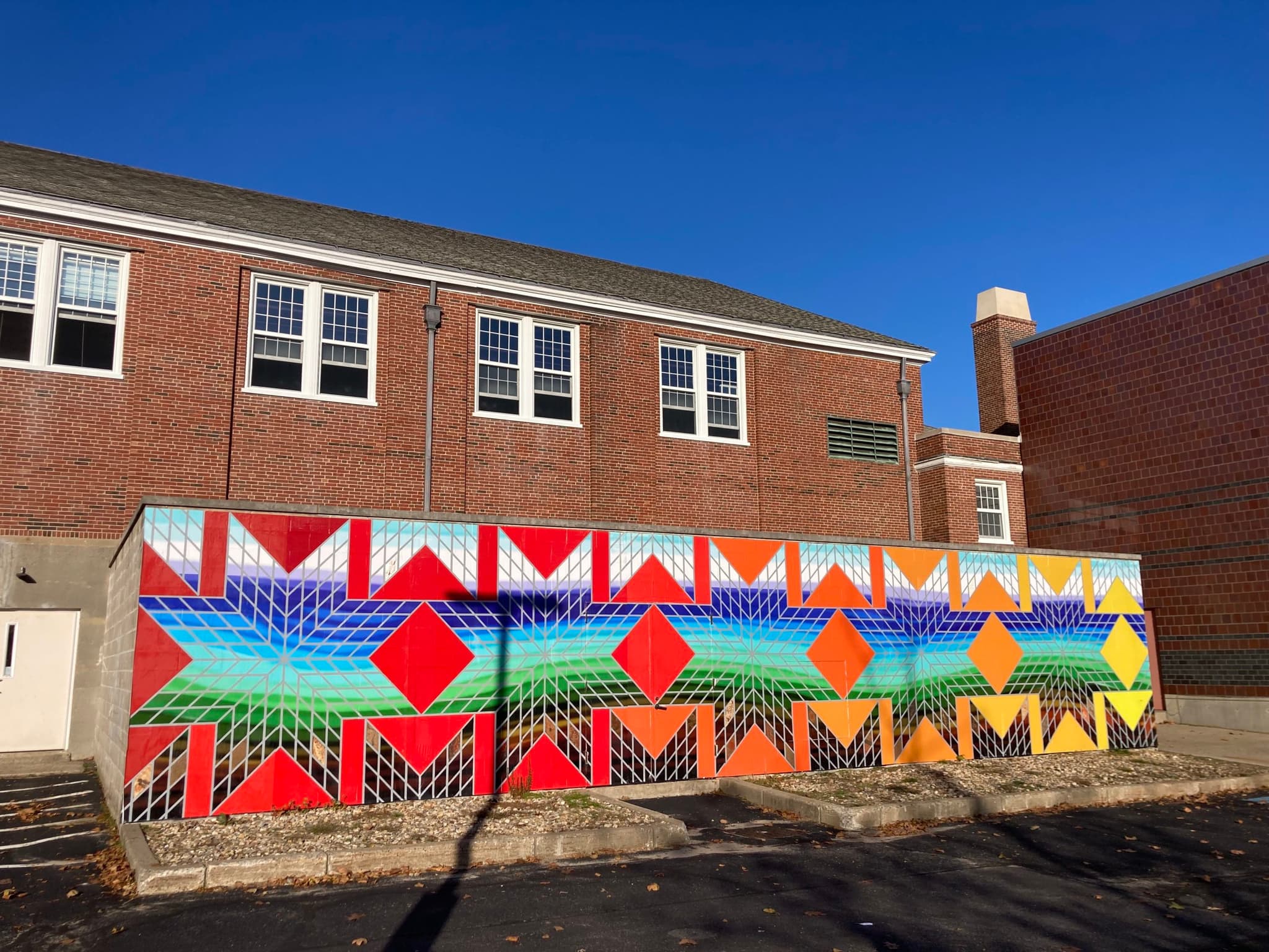Having spent a lot of time outside this year, I was excited to see how many formerly bare walls around me became canvases for murals. Closest to my Medford home, I spotted Amanda Hill’s A Journey Through Medford (which took nearly three years of cutting through bureaucracy and COVID-related delays to complete) adding a little color to Haines Square. Nearby, Erin Genia’s Wakpa outside Tufts Art Galleries provides a visual and aural respite on campus. Both Genia and Hill reference the Mystic River, though with vastly different visual language. While Hill’s depiction focuses on our engagement with nature in a realistic and community-centered manner, Wakpa, which takes its title from the Dakota word for “river,” uses geometry (specifically the Morningstar) to present an Indigenous perspective on our connections to the land.