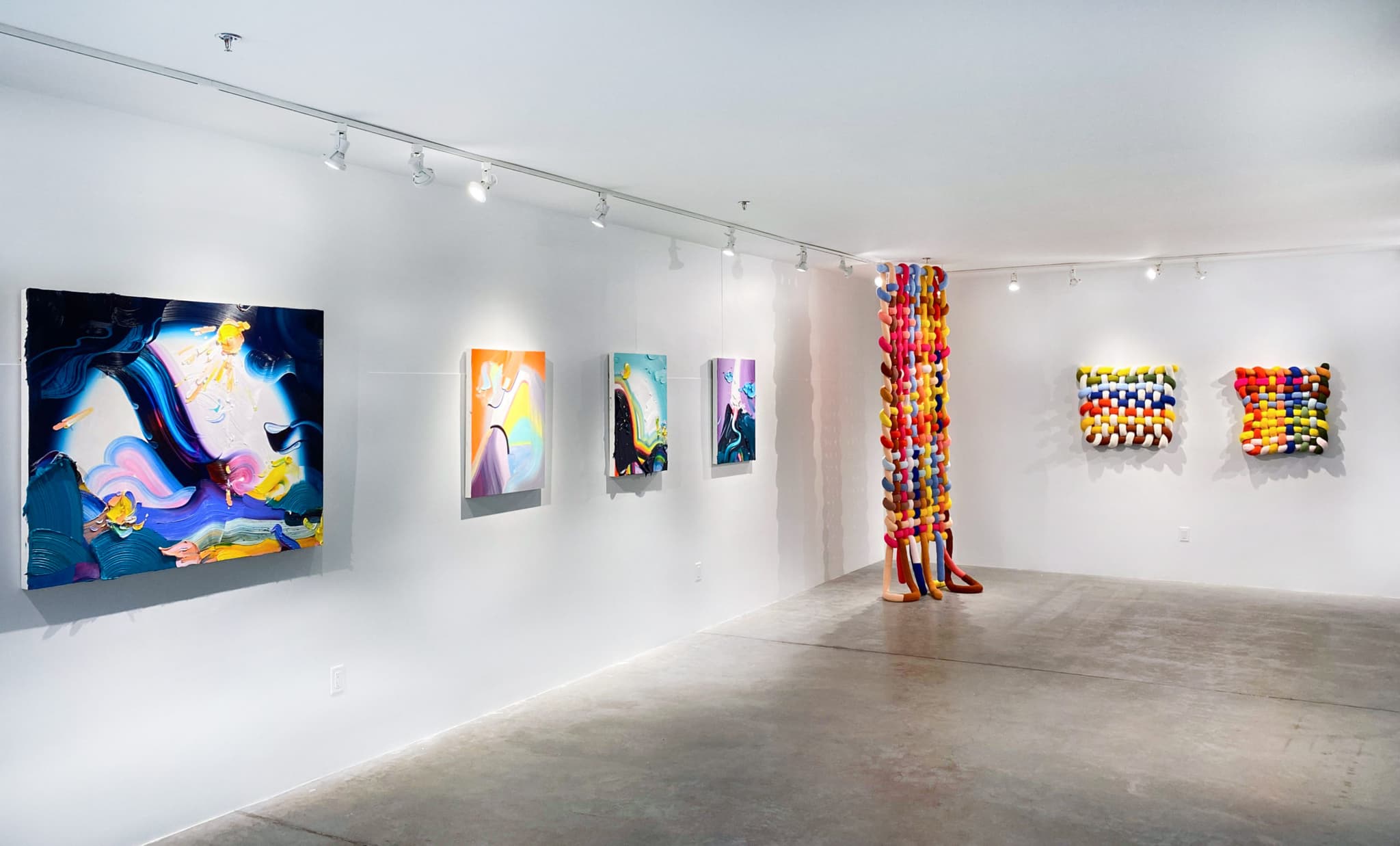 Loree’s paintings are like a psychedelic night sky: electric-colored ombré sunsets, candy-colored stars, or sprinkles. The 3D texture of the paint oozes off the canvas, a celebration of the medium’s ability to move, vibrate, dance. I still think about the whipped dollop of sugary pink in Thought Bridges. The rainbow palette in Loree’s paintings partners with Katrina Sánchez’s fiber pieces, which likewise exemplify color’s ability to create a visceral reaction. Life Source, a floor-to-ceiling installation, was the star of the show. The interwoven rings of fuchsias, yellows, light blues, peaches, creams, reds, and browns concocted something like a playground slide from the heavens. Like Loree’s works, Sánchez’s fiber pieces also play with texture. The whole gallery feels dynamically alive in its vibrant color and movement, the hands and imaginations of the artists still present in the space.