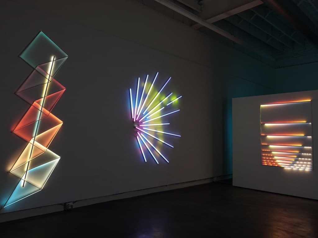 “Space Folding” at Praise Shadows was another special exhibition. James Clar works in digital media, light sculptures, and new technologies, and his Boston debut at Praise Shadows felt playful, clever, and new. Clar’s Freefall series uses colored LED lights to cast a portrait of a figure suspended in mid-air. How exciting to see art manifest between its materials—to try to hold the bleeding light, to know it. In Nobody’s Home, a generic wooden door looks like it leads into a conference room. Beneath the door, LED lights and accompanying shadows show footsteps passing. This work accesses some deep mystery—I even asked gallery attendants if I could open the door. I love art that sparks some true curiosity, prompting a need to ask someone, “What’s beyond?”