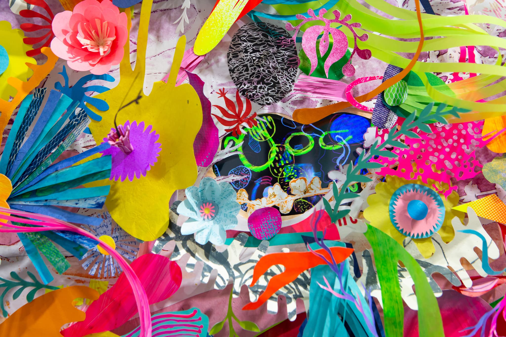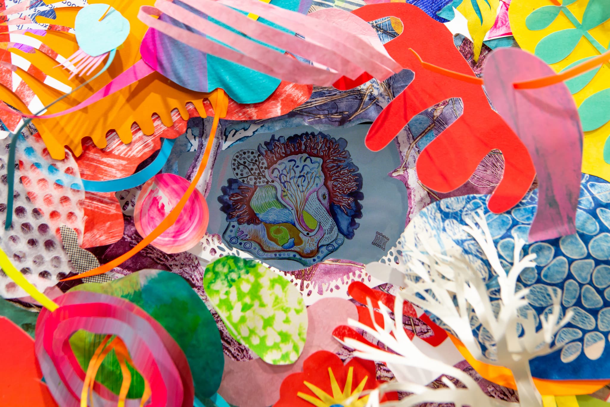 “I’ve been trying to keep away from purely digital work,” Erdelyi notes. “Partly I think it’s just because I have this background with craft and working with my hands and touching things, so I consider the work I’m doing a hybrid animation process. It’s analog and digital combined.” That’s also true of her second work in the exhibit, a new wall piece called Ma Femme Maison (2019) that presents two exuberant collages connected by a hot-pink umbilical cord. These riotous forms arise from found papers and monoprint scraps that have been carefully cut like lace, bored with holes like Swiss cheese, or fashioned into orbs, organs, feathers, and flowers. Most of the colors are neon-bright hues hard to find in nature, but the shapes are organic, by turns botanical, aquatic, anatomical, cosmic. Each wild yet delicate assemblage surrounds a small LED screen that plays looping animations inspired by nineteenth-century drawings of developing embryos.
