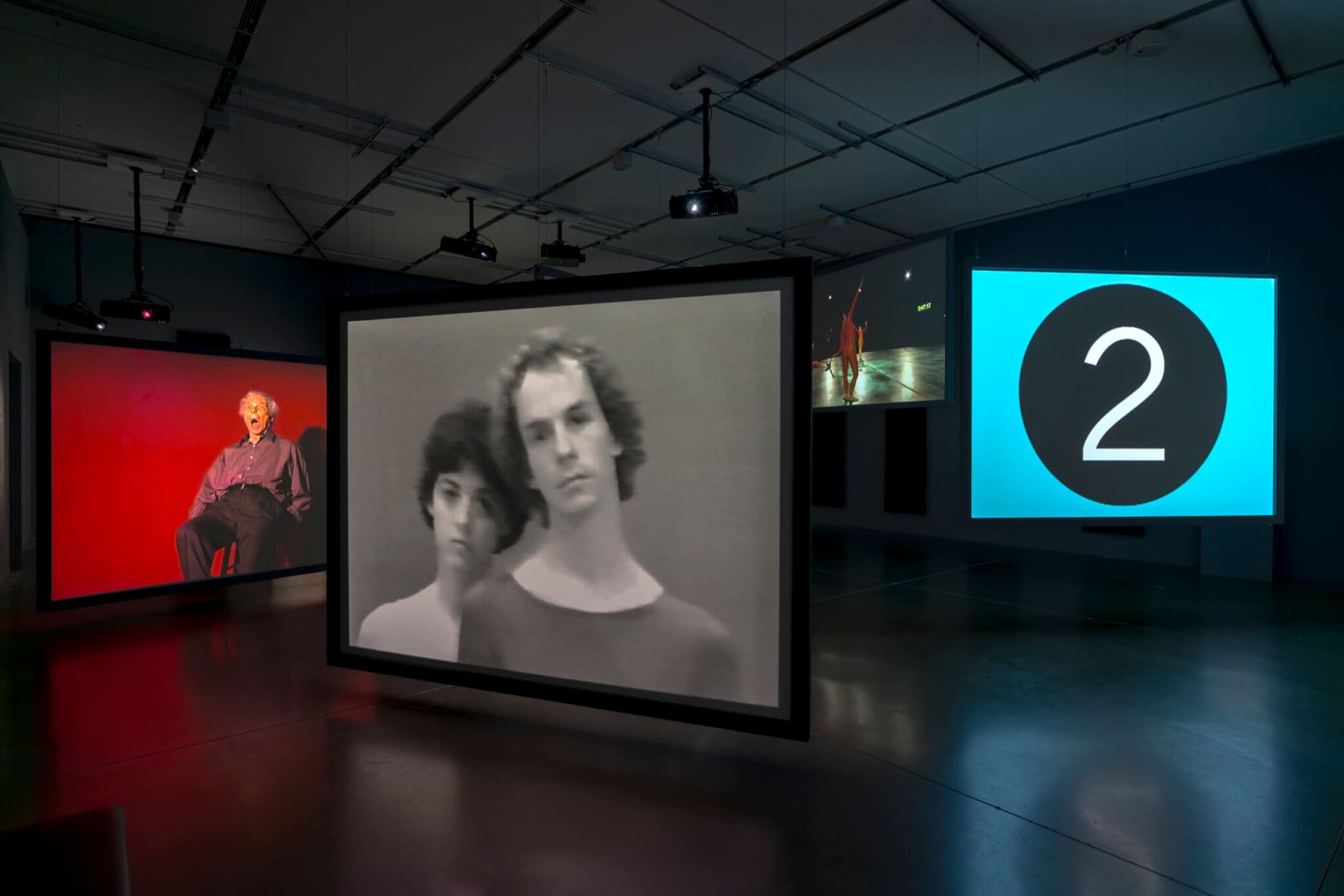 Atlas has long navigated the polarity of two intersecting but distinct worlds: modernist avant-garde dance and queer underground subcultures. If A Prune Twin represents the latter, the installation MC9 (2012) represents the former, as embodied in the figure of Merce Cunningham. It includes clips from dozens of their collaborative works, from Walkaround Time (1973) to Ocean (2010), representing a decades-long exploration of how dancers and cameras can interact. The work’s spatial presence creates its own kind of choreography—bodies rush across the room, gathering and dispersing like atmospheric patterns of pressure and vapor. The soundtrack jumps from minimal flute to electronic noise, and is sometimes overtaken by the tender sound of dancers’ feet on the floor. As with A Prune Twin, sensory overstimulation is balanced with moments of order. Individual screens periodically flash to brief sequences of a colored countdown leader, lending the work a sense of urgency and careful calibration. These flashes of color, sometimes coordinated across screens, create moments of alignment between different rhythms, like dancers converging to share a pose onstage. As fractured as it is, MC9 functions as a single machine of dance and images and time.