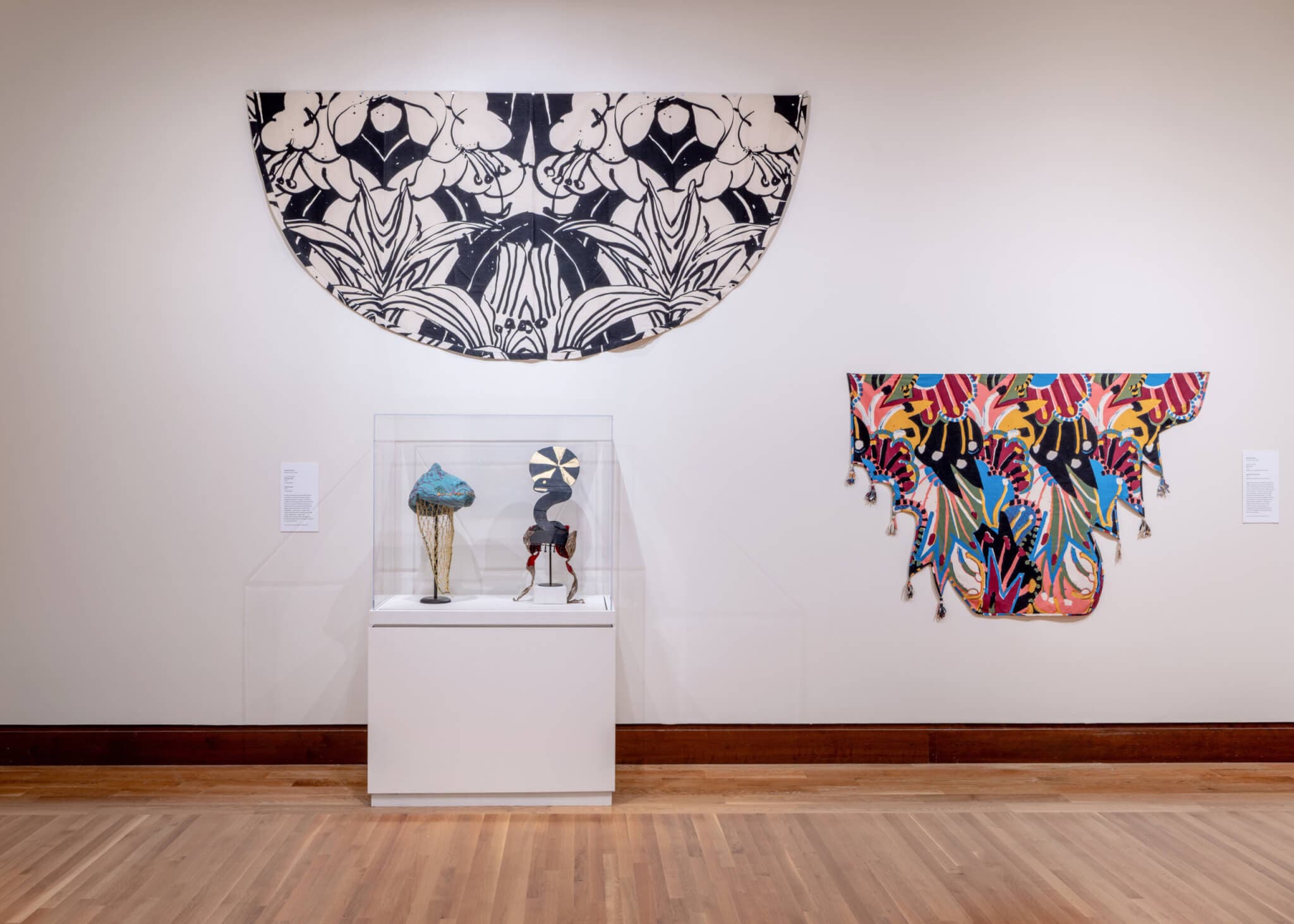 (top) Robert Kushner, Lilies Cape, 1977. (bottom right) Robert Kushner, Hawaiian Punch Cape, 1977. Installation view, “Embellish Me: Works from the Collection of Norma Canelas Roth and William Roth,” Currier Museum of Art, 2026. Photo by Morgan Karanasios. Courtesy of the Currier Museum of Art.