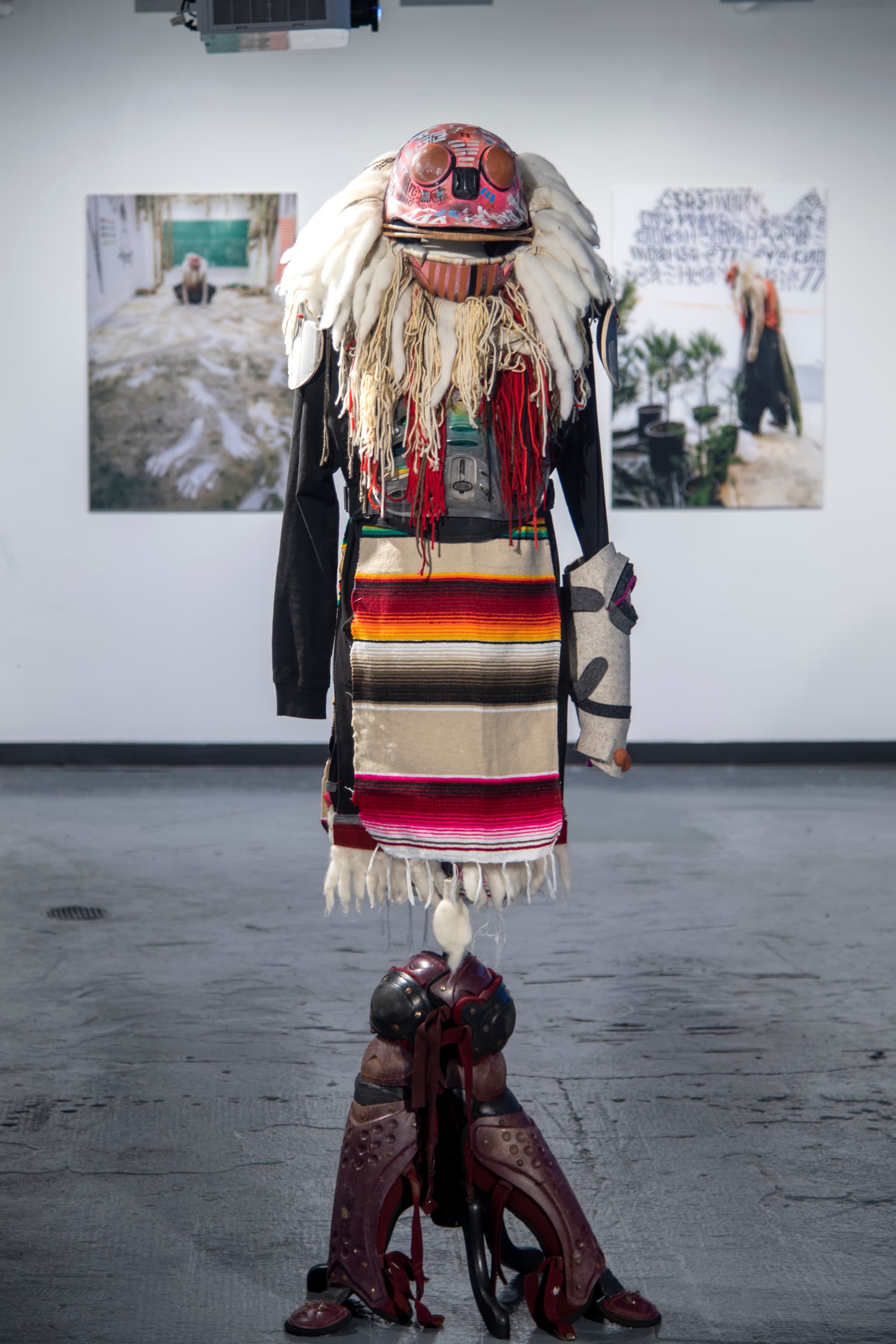 Throughout the rest of the space, figures with elaborate clothing stand like stoic warriors. Although the suits of armor that adorn these figures have visual ties to sacred Native American objects, the regalia represented here is imagined rather than actual. The recycled components of yarn, sports equipment, and strips of fabric which comprise the regalia are multivalent: the reuse of these items cements Lugers warnings and calls for personal accountability. Despite the powerful message these figures carry, Luger adds a sense of humorous incongruity—one normally doesn’t think of football helmets as being traditional Indigenous attire. The curator provides a context for the suits’ physical presence by showing images of their activation in a previous performance titled “AFRAID NOT.” The inclusion of these photographs, a new development from previous iterations of this exhibition, is helpful in understanding the artist’s body of work and how it affects his current intentions. It is clear that these objects have a life beyond gallery walls, directly challenging colonial ideas of “preservation.” Interspersed between these cinematic stills of Luger’s past performances is a lively depiction of the origin myth behind the exhibition. Luger painted this hieroglyphic history across several walls and columns in the gallery as one of the storytelling performances organized by the curator.