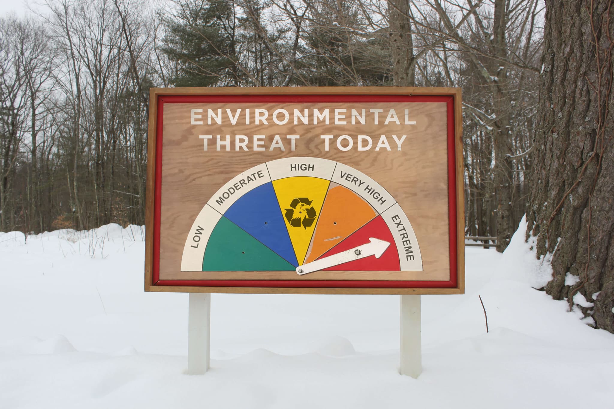 The reality is that the Eastern Hemlock is just one of many species facing extinction or significant loss around the world as part of the ongoing sixth extinction. At the end of the trail, a blue and white flag hangs with a bright red triangle in the center. We’ve learned from Borden that the triangle, or delta, always refers to change. The flag is quite blunt, both in composition and message. Six withered and fallen trees comprise the tally marks that note our fate. Human overpopulation and consumption threaten thousands of species, not least of which is humanity itself. When we think about the end of human civilization, we often ignore the mass extinctions that will precede it; the methodical disappearance of one species after another, the slow goodbyes.