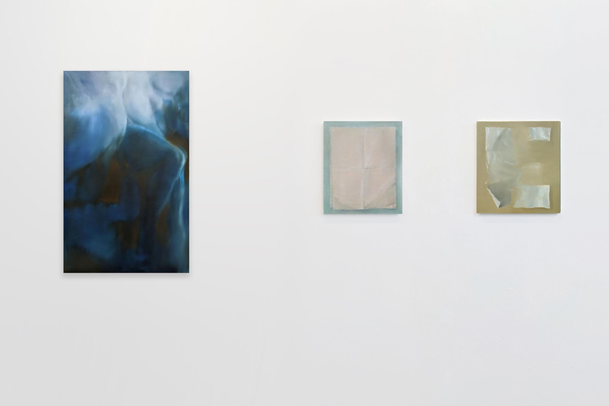 (Left) Micha Patiniott, Rapture I (after the relief The Human Passions by Jef Lambeaux, 1898), 2023. Oil on canvas. 105 x 65 cm. (Center) Micha Patiniott, Vellum III, 2023. Oil on canvas. 45 x 38 cm. (Right) Micha Patiniott, Vellum VIII, 2023. Oil on canvas. 45 x 40 cm.