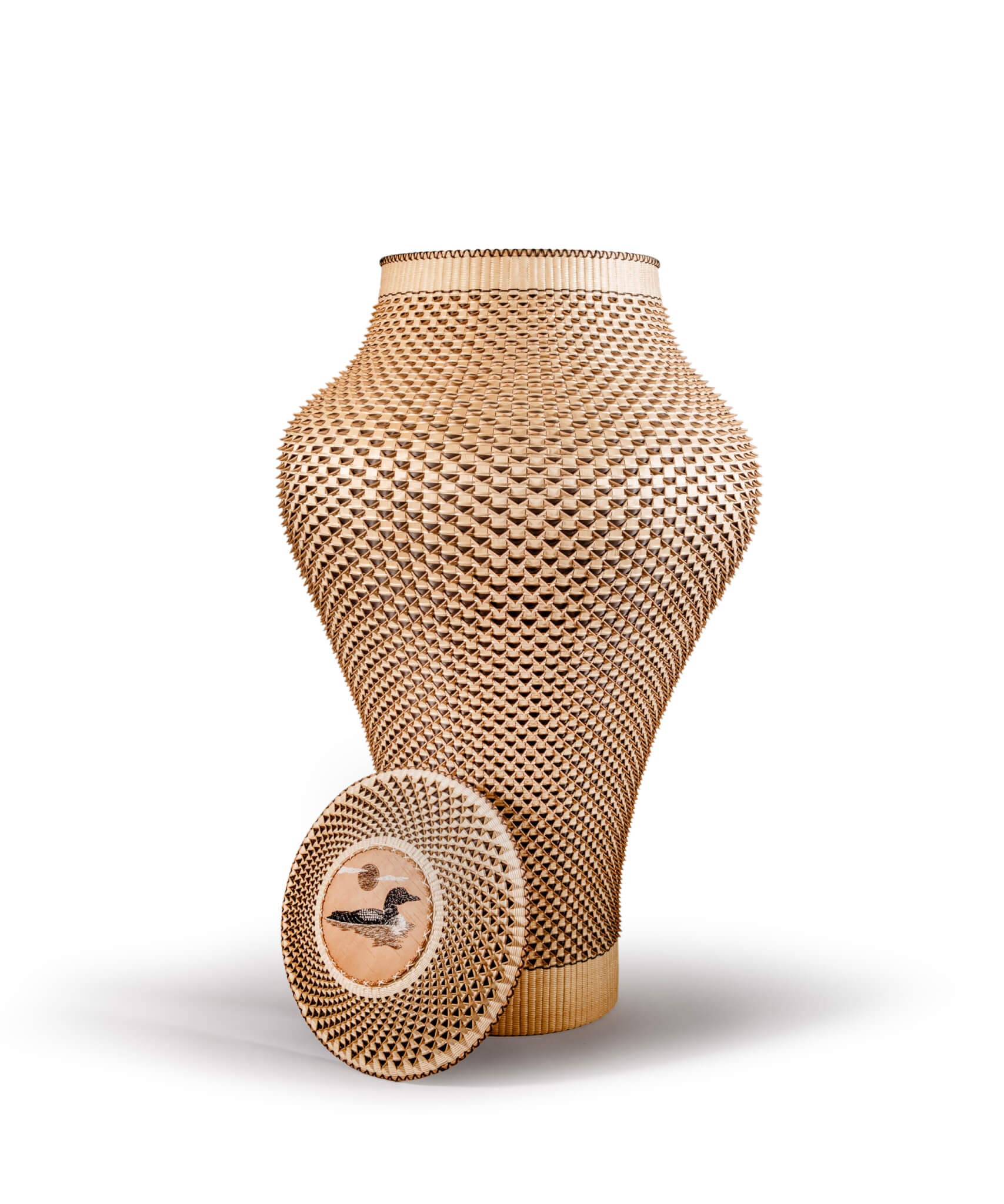 Jeremy Frey (Passamaquoddy, born1978), Loon, 2020, ash, cedar bark,porcupine quill on birch bark, and dye, 36 x 23 x 23 inches. Private collection of Catherine Stiefel, California. © Jeremy Frey. Photo by Eric Stoner.