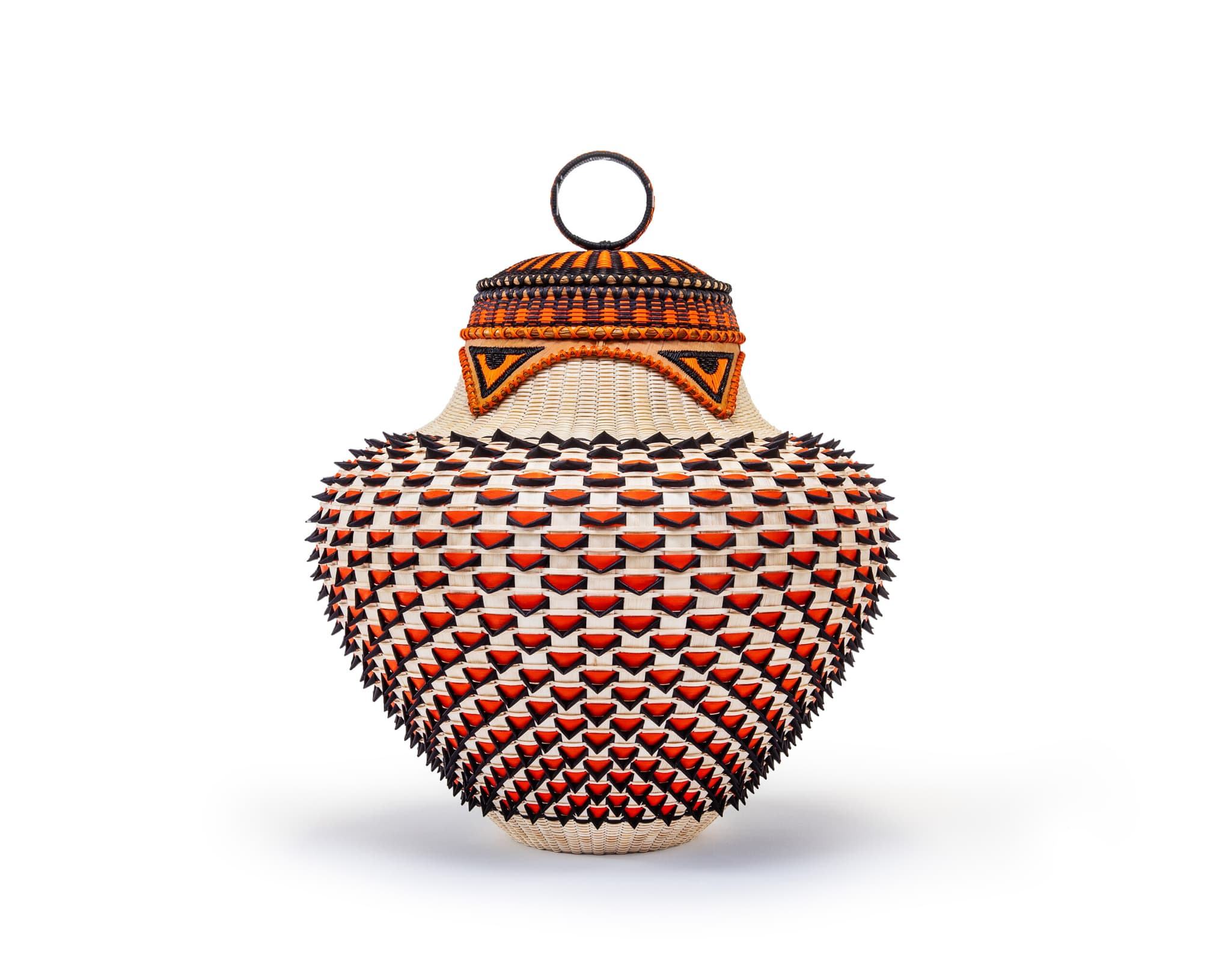 Jeremy Frey (Passamaquoddy, born 1978), Observer, 2022, ash, sweetgrass, porcupine quill on birch bark, and dye, 13 1/2 x 10 1/2 x 10 1/2 inches. Collection of Carole Katz, California. © Jeremy Frey. Image courtesy Eric Stoner.