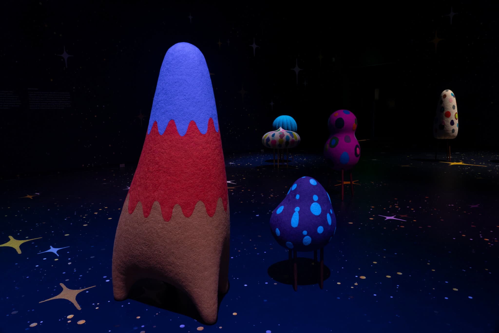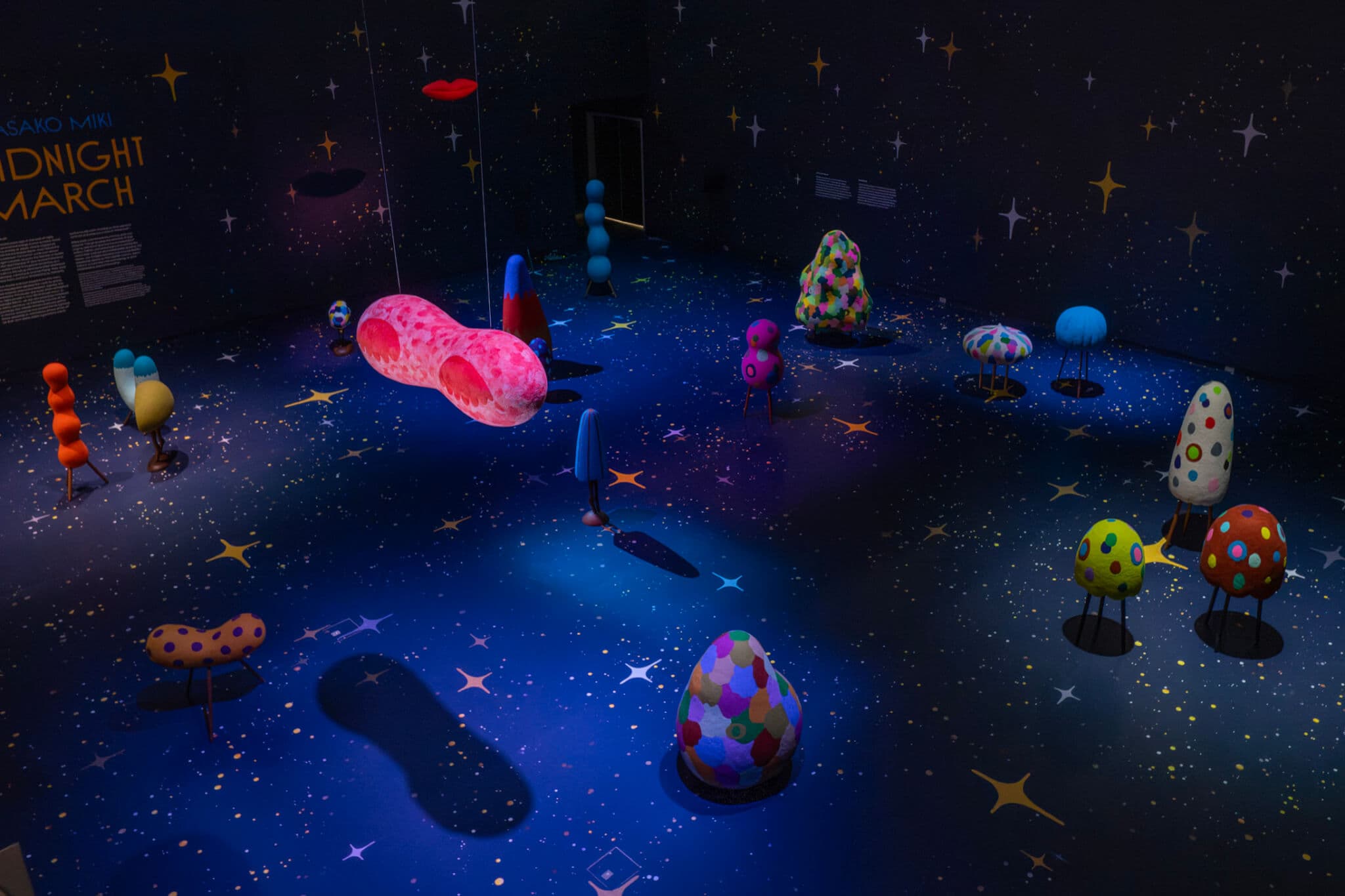 The bulk of the show is displayed in MAAM’s Stephen D. Paine Gallery, a vast, high-ceilinged, square-shaped room. Last year, it was in this gallery that the museum presented Nicholas Galanin’s “Aáni yéi xat duwasáakw (I am called Land),” an arresting installation involving a roboticized drum and video projections that commanded the large space it occupied. “Midnight March,” in contrast, feels sparse. Eighteen sculptures are spread out across the floor, mostly isolated from each other by a few yards of distance, though some stand near each other in uncertain companionship, proximate but not quite cohering into groups, illuminated by spotlights that beam down from above. Two sculptures—one taking the form of vivacious red lips, the other resembling a pair of dreamily closed eyes—are suspended from the ceiling. The only other presence in the room is the overly literal midnight blue wallpaper, which is splattered with the kind of four-pointed stars that make up the sparkle emoji and have come to symbolize the “magic” of artificial intelligence. MAAM’s website describes the installation as an “experiential world,” yet I didn’t feel that there was much world to experience.