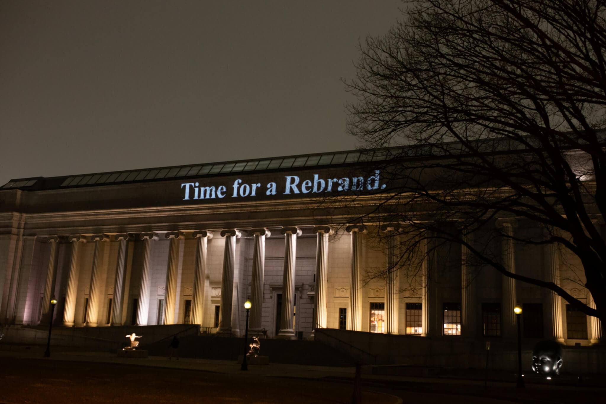 “Time for a Rebrand” is projected on the Fenway entrance of the Museum of Fine Arts, Boston on March 31, 2026. Photo by Marianna McMurdock for Boston Art Review.