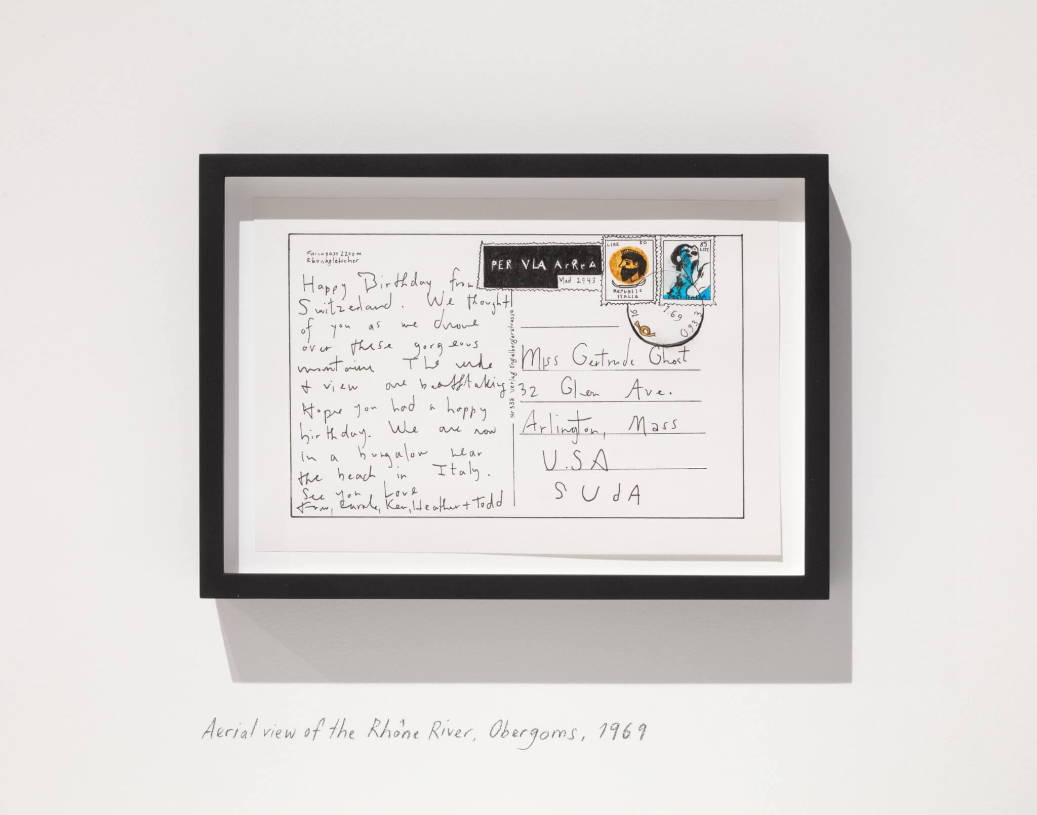 A short, narrow hall connects the exhibition’s two galleries; hanging here are seven drawings that recreate the backs of old postcards mailed from tourists visiting the Rhône Glacier, a reminder that there is more history behind the glacier than time in front of it.
