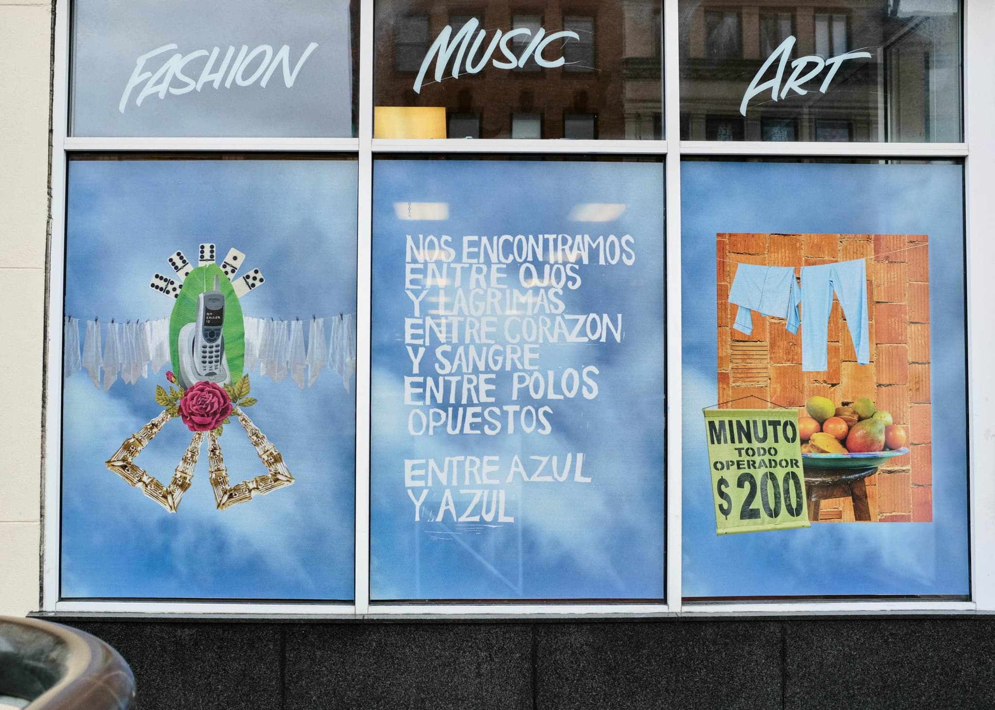 Doorknocker hoops, mangoes, prickly cacti, a line of clothes hanging out to dry: Paola de la Calle’s work Entre Azúl y Azúl (Between Blues) incorporates images representing the Caribbean, Latin American, and African immigrants that filled Central Square’s streets. Created for and displayed in windows at 596 Mass Ave in Cambridge, de la Calle’s artwork tackles the issues of displacement and the rising financial barriers of access for the communities that call—or once called—the neighborhood home.