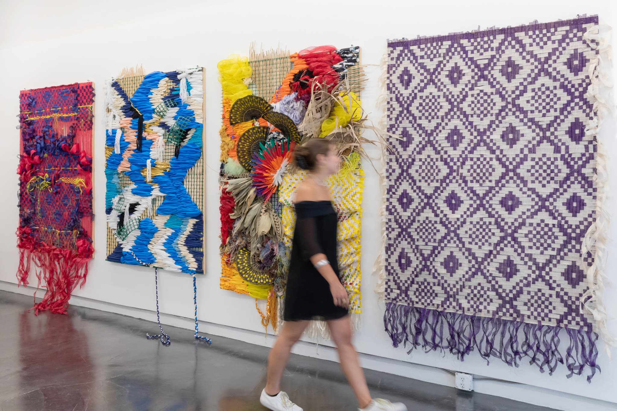 Installation view of “Tago ng Tago (Hidden and Hiding),” on view at Boston University’s 808 Gallery November 3–December 1, 2022. Alan has activated the center weaving, Diasporic Threads (2021–2022), in multiple performances. Photo by Jessica Shearer.