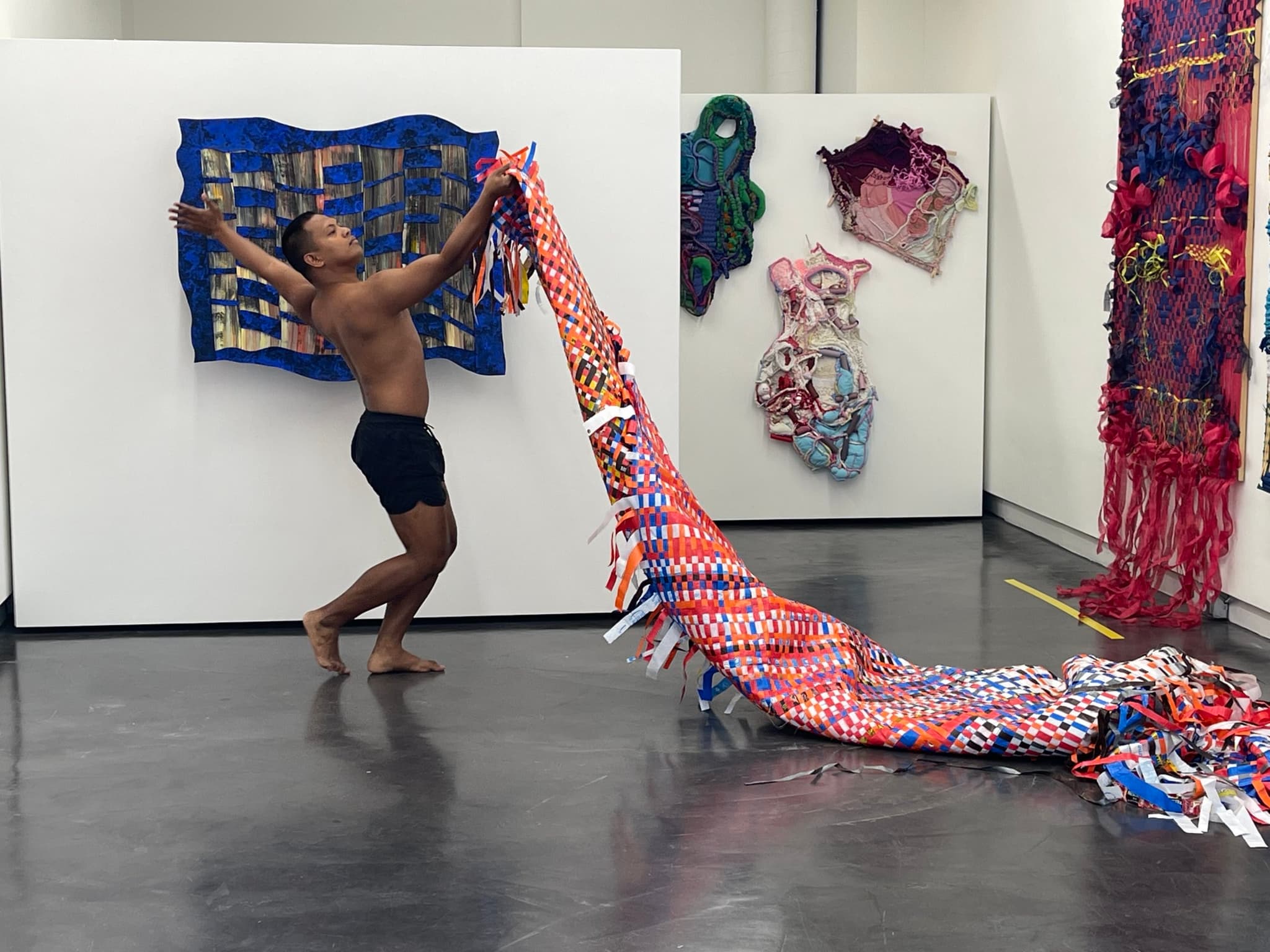 During his Pagbawi (“pag-ba-wi”) | Reclaiming performance at Praise Shadows Art Gallery, Alan modified a traditional Filipino dance and chant, activating his Diasporic Threads (2022) baníg. Photo by Jessica Shearer.