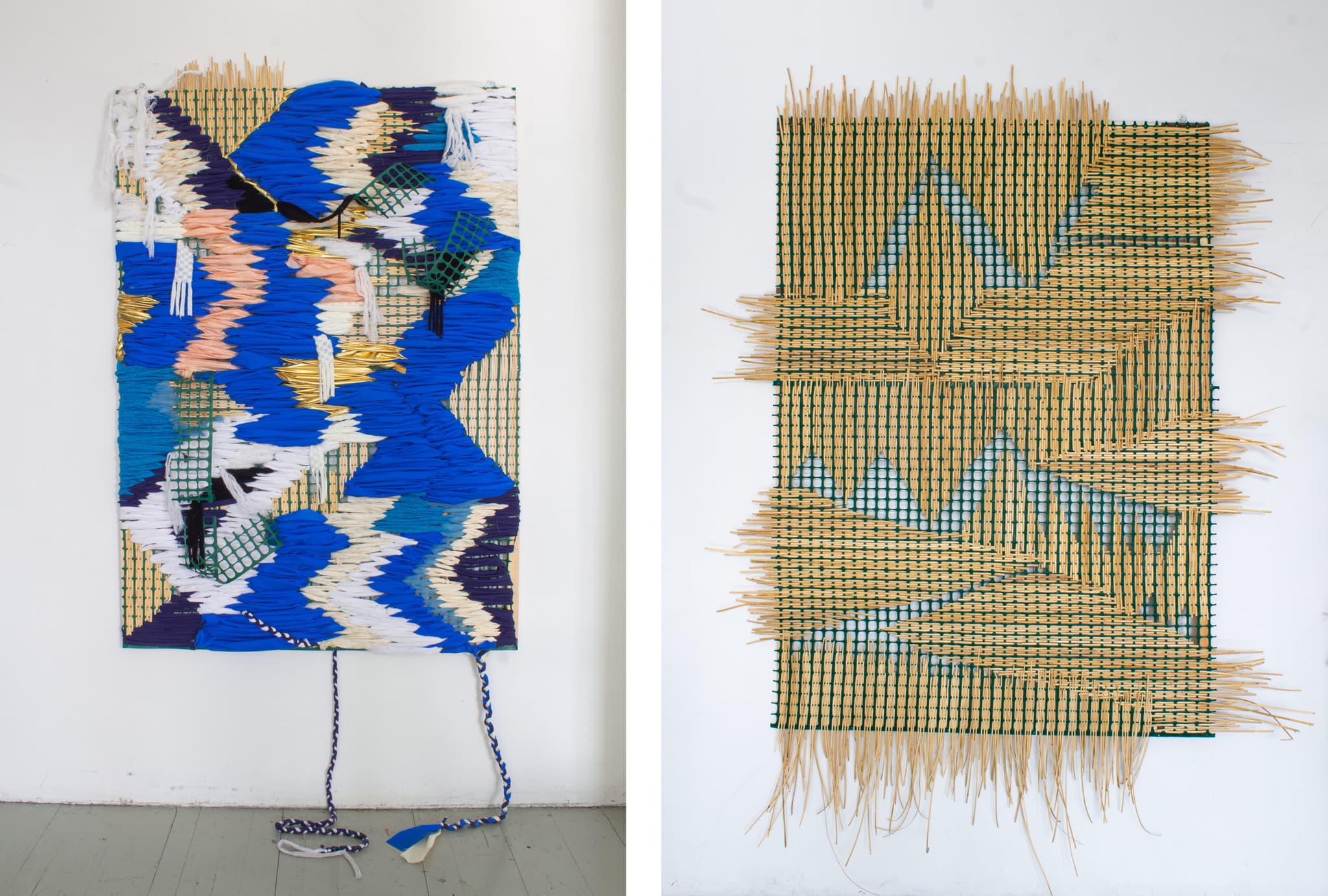 Right: Bhen Alan, Mermaid’s Tail, 2022. Rattan, fabric, abaca, and industrial plastic fence on stretcher bar. 72″ x 51″. Left: Bhen Alan, Midday Landscape in the Orient, 2022. Rattan and industrial plastic fence on stretcher bar. 84″ x 60″. Photos courtesy of the artist.