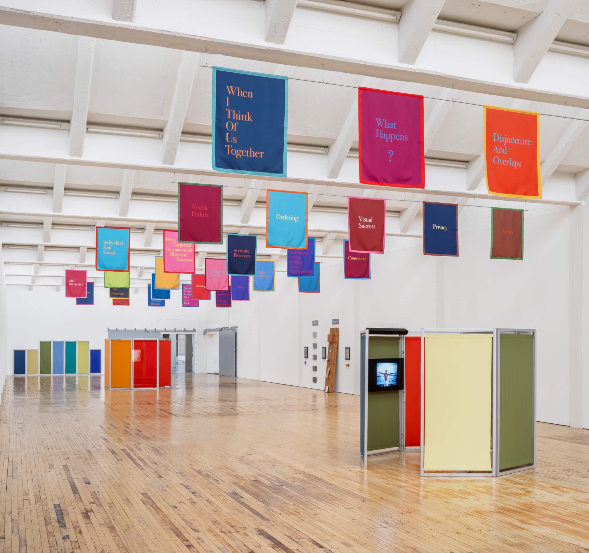 Flown to celebrate, honor, and memorialize, flags carry the weight of stories that came before. For Renée Green, they interweave disparate artistic legacies in orchestral arrangements. At Dia Beacon, Green’s vibrant banners draw the gaze upward with dye-sublimation printed fabrics spanning the rafters. Rendered in canary, magenta, indigo, and mustard, the panels host fragments of poetic text—both their positioning and the language on them making use of voided space. As visitors meander below, they gather prose as mementoes of their own travel. A sequence reads, “Constellations Of People And Places / Journeys / Span / Crossings / Bifurcations / Welcoming Capacious Not-Knowing / And Acceptance.”