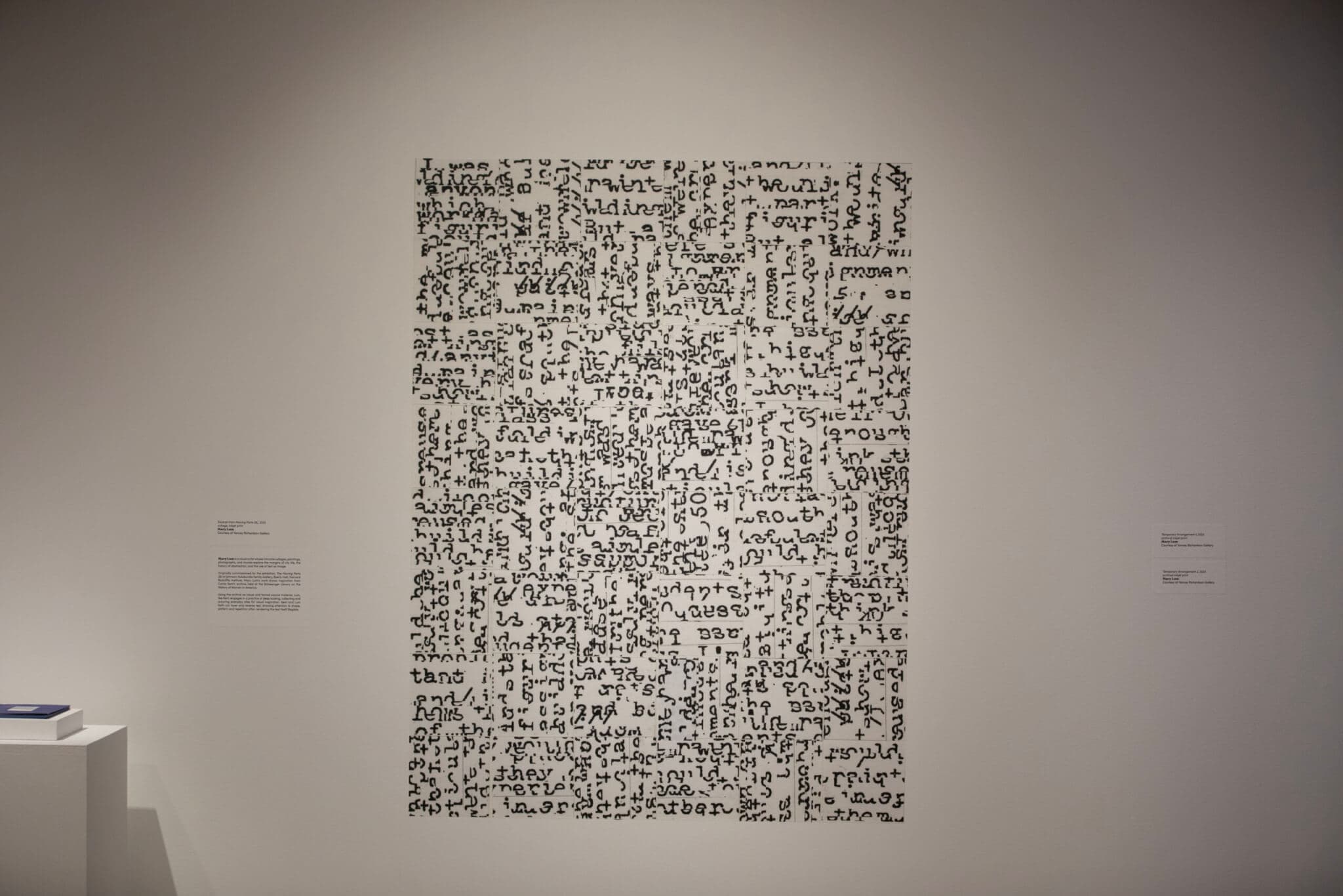 Contemporary projects are interspersed throughout, and it is hard at times to understand the logic of the hang. A blown-up page of an artist book by Mary Lum configures the lettering from the “Papers of Corita” archive at Harvard into a patchwork quilt of illegible cyphers. Inspired by Kent’s deviceful graphic design, Lum’s piece is clearly tied to her legacy. However, by using the uniform typewritten pages of the archive, Lum’s interpretation doesn’t formally recall Kent’s often askew, lopsided typography. While this is a completely understandable artistic departure, a topical connection in process or material would have better bridged the new with the old. Kent’s Rules could have been useful here, offering a structure to thematically tie Lum’s work to her vision.
