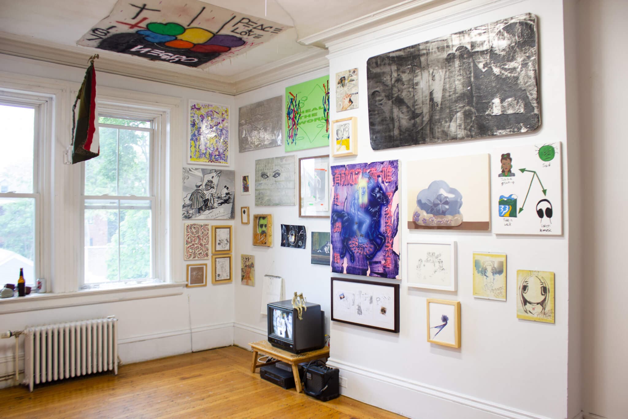 “Scene” at Apartment 13 Gallery in Providence is a salon-style exhibition featuring works by sixty-six different artists. In a statement posted on Instagram, the gallery writes, “There is no scene,” and further explains how the internet has created a decentralized free-for-all of art and visual culture. Perhaps scenes are more fleeting than they once were, less about location and more about happenstance or a micro-zeitgeist. “Scene” collects the pieces of an ever-fluctuating network, and beautiful moments emerge, like Rolf Nowotny’s monstrous couple DOLDRUM, the waxy, spiky, hairy miniature pair resting on a video monitor. Apartment 13 Gallery creates the conditions for audiences to learn about new artists, expand their roster, and make new connections—each individual’s scene co-existing in infinitude.