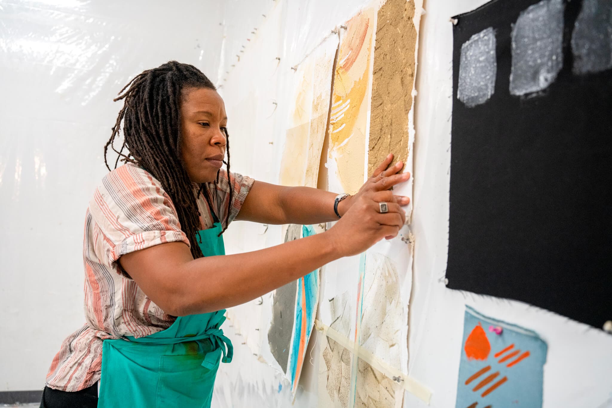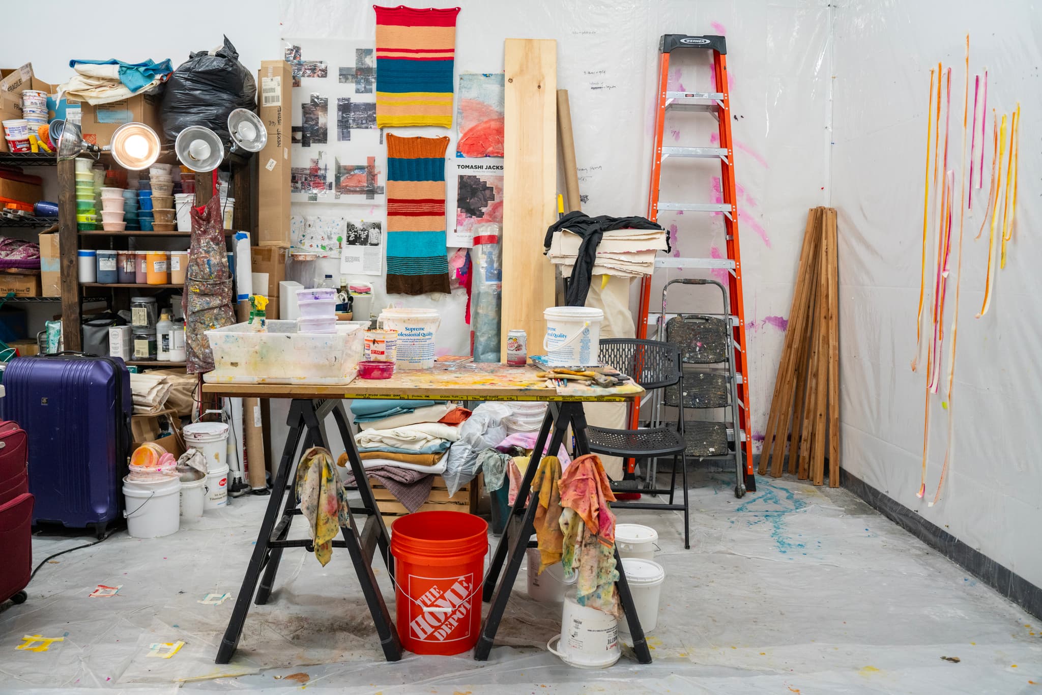 (both) Inside Tomashi Jackson’s Somerville studio. Photo by Olivia Slaughter for Boston Art Review.