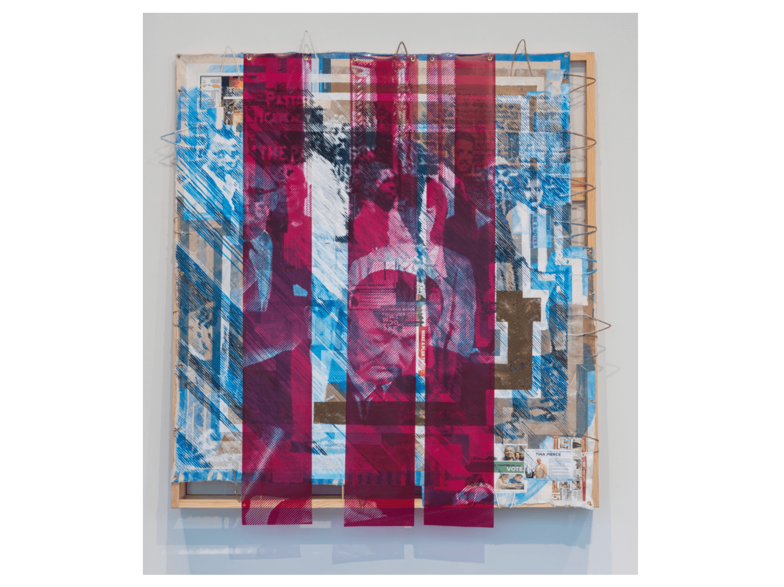 Tomashi Jackson, Time and Space (1948 End of Voter Registration Line) (1965 LBJ Signs the Voting Rights Act), 2020. Acrylic, Pentelic marble dust, Ohio Underground Railroad site soil, American electoral ephemera, and paper bags on canvas and fabric, 89.375 x 83.75 x 8 inches. Courtesy the artist and Tilton Family Collection. Commissioned by the Wexner Center for the Arts at The Ohio State University.