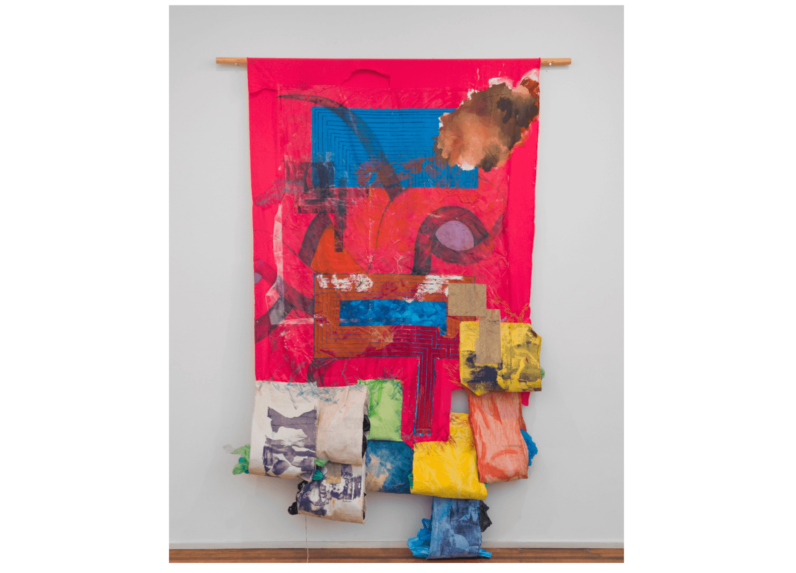 Jackson recognizes that the triumphant desegregation of schools and deplorable police violence toward Black women and girls are interrelated. She layers both immaterial concepts of time and space and physical materials like paint, dirt, canvas, plastic, and wood in the work. Photographic image transfers of the events surrounding the two historical moments sourced from archives and media outlets are placed throughout Dajerria All Alone. These photographs usher real people into the abstract painting while the painting’s vibrant colors bring these people into the now. Jackson speaks to both physical and metaphorical baggage at the bottom of the work, where canvas pockets are filled with plastic bags—held over from her plastic waste studies in Belize—answering her question about a painting’s capacity to hold something.