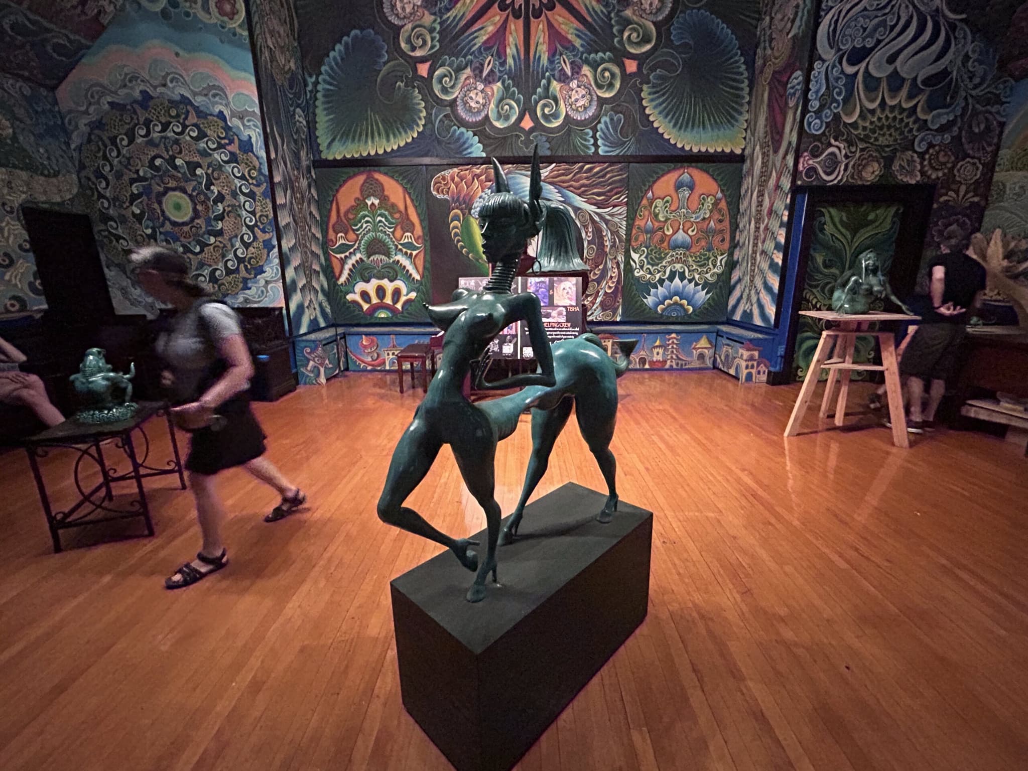 Shaplyko brings me finally to the Paradise Retreat toward the back of the house. We sit in plush couches draped with layered textiles, and on each surface stands various decorative tchotchkes from all over the world. Here, as the rain patters the skylights above, Shaplyko explains the history and philosophy of the museum. After purchasing the property in 2002, the couple began to gradually transform the space into a house of the muses. Each room has a theme, and nearly every surface hosts a painting created collaboratively by Shaplyko and Sorokina. The couple does not use preliminary sketches; each mural becomes an energy net, catching each subconscious design expressed through an instantaneous hand. Each piece begins with a black background. White reflects energy, Shaplyko explains, black absorbs.