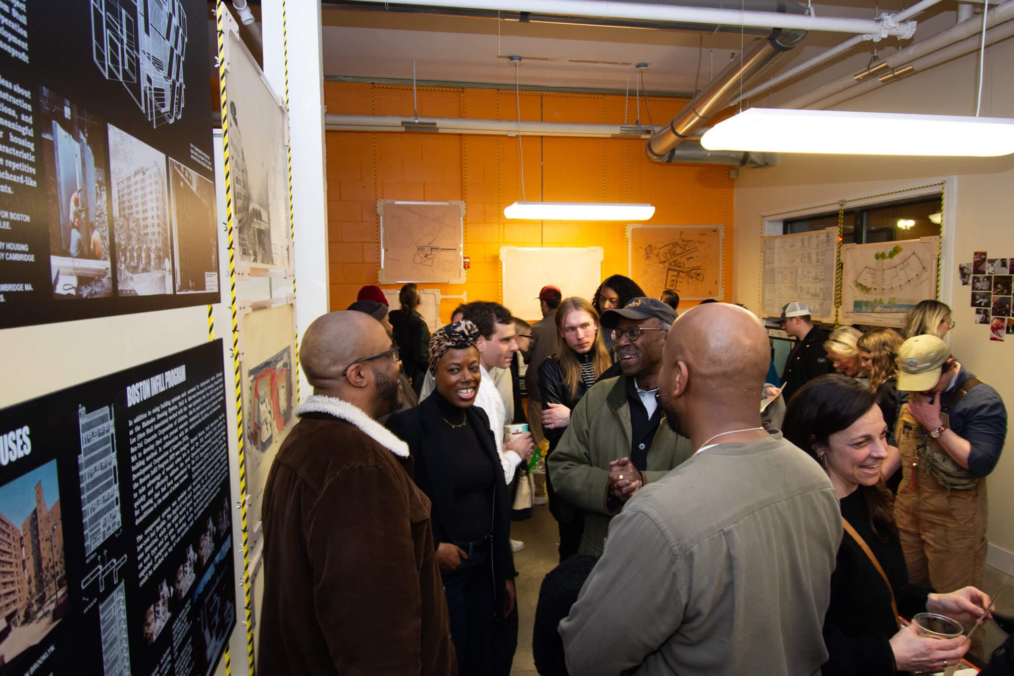 Opening reception for “Stull & Lee: Black Architecture Vision for an Infrastructural City” at YouthBuild Boston’s Designery in Roxbury on February 29, 2024. Courtesy of Wandy Pascoal.